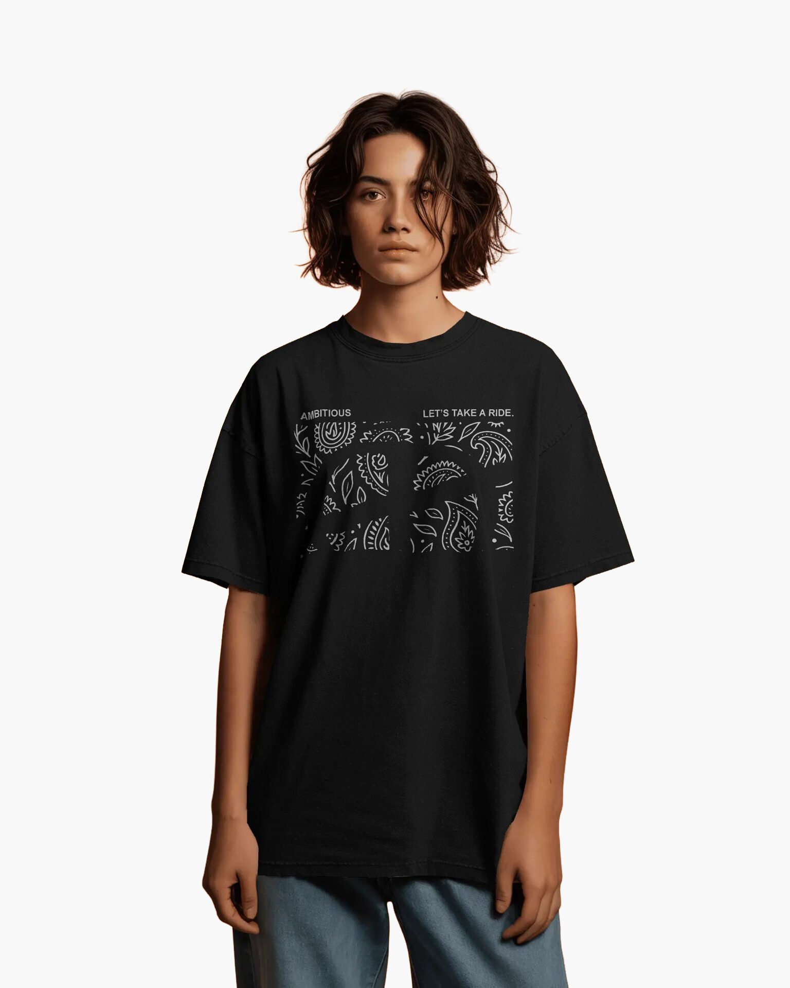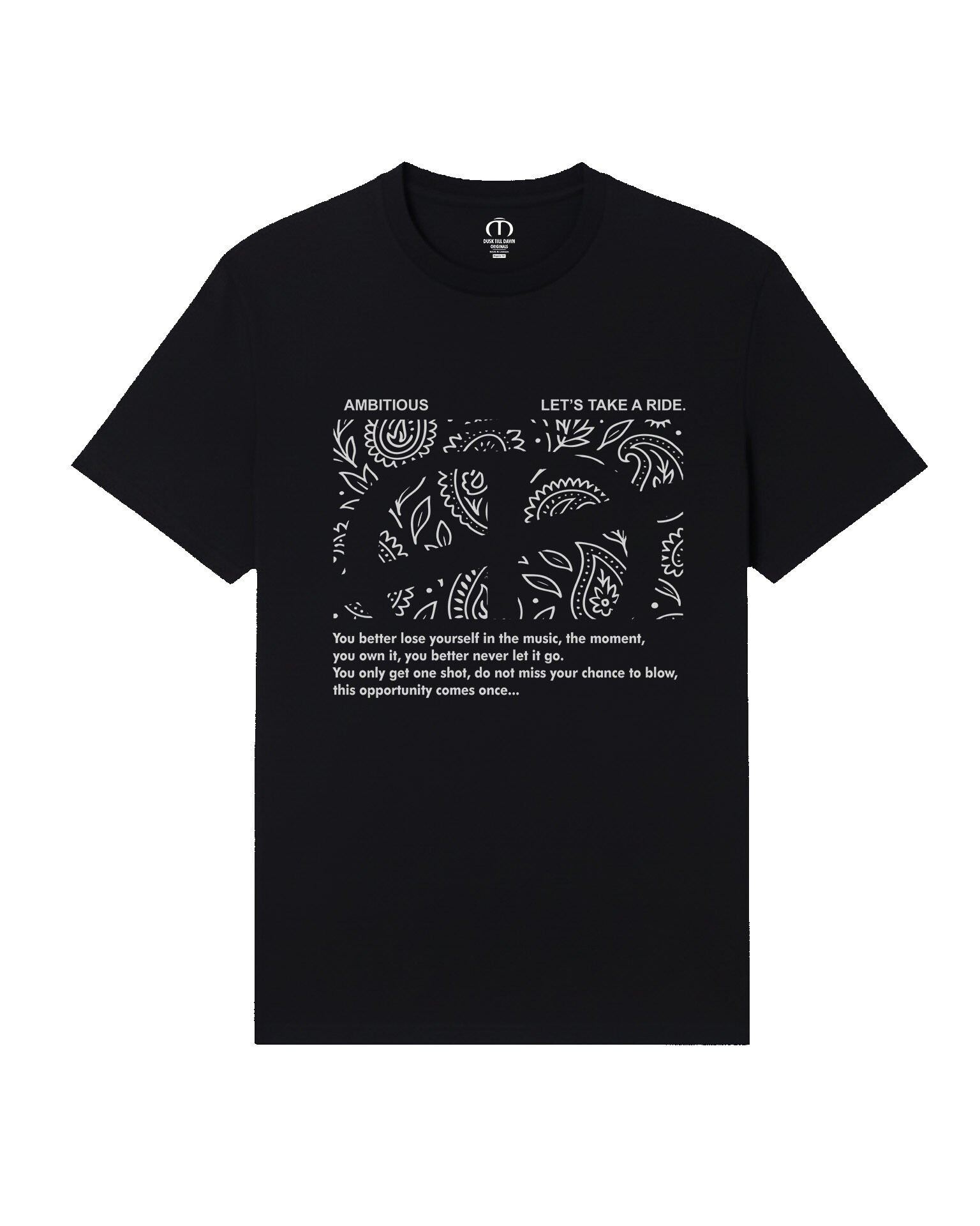 Unleash your inner drive with the Dusk Till Dawn – Ambition Paisley Tee, designed for those who chase dreams from sunrise to sunset. Featuring a bold paisley block embedded with the word “DTD,” this black tee is more than style—it’s motivation.