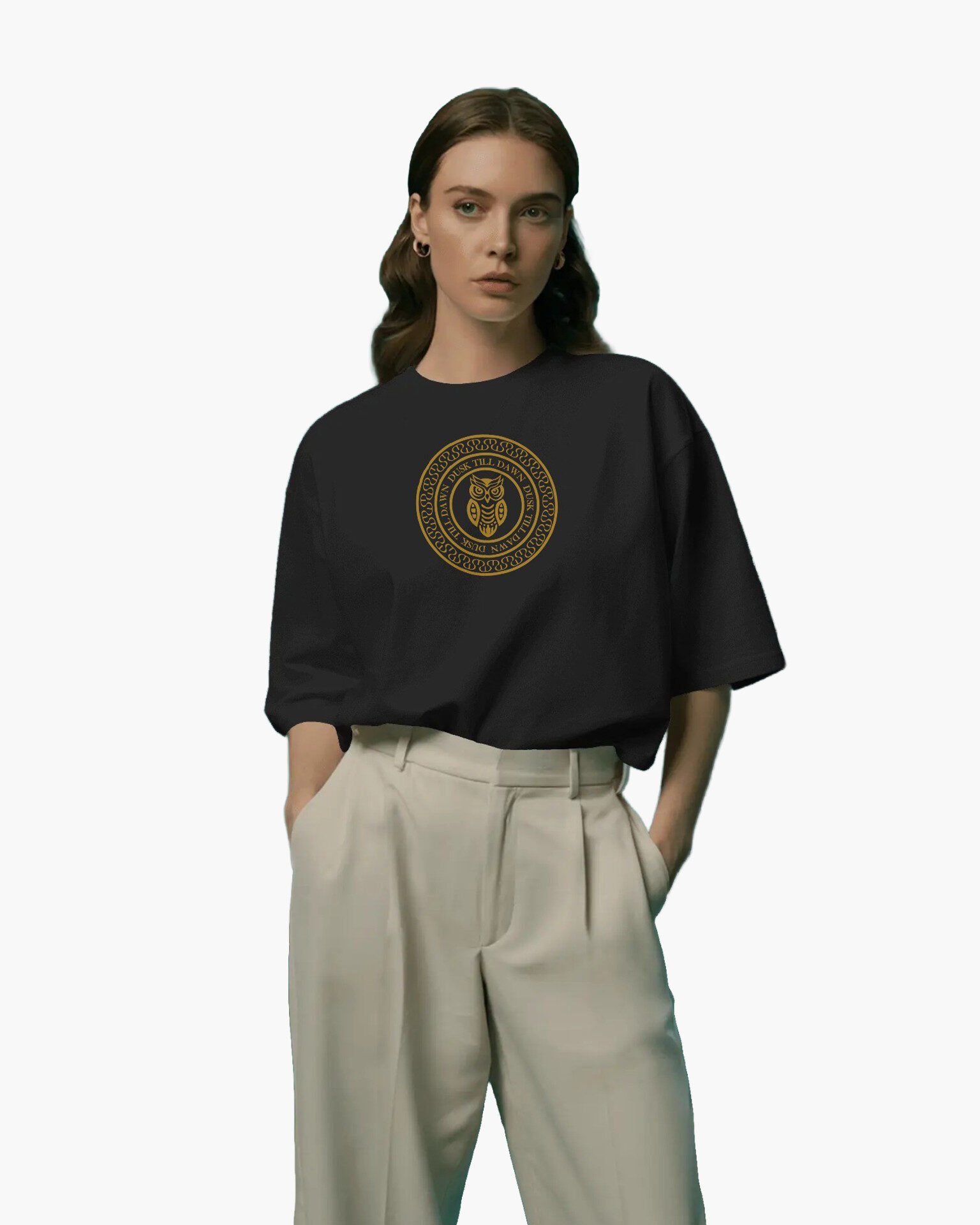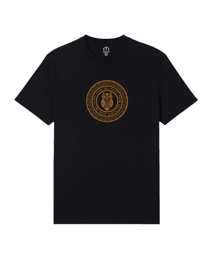 Elevate your streetwear game with the Nocturnal Emblem Tee from Dusk Till Dawn. Featuring a regal golden owl surrounded by a hypnotic circular crest, this black tee speaks to the bold, the watchful, and the wise. A perfect fusion of mystery and power, this shirt is designed for those who thrive in the twilight—where day meets night and purpose never sleeps.
